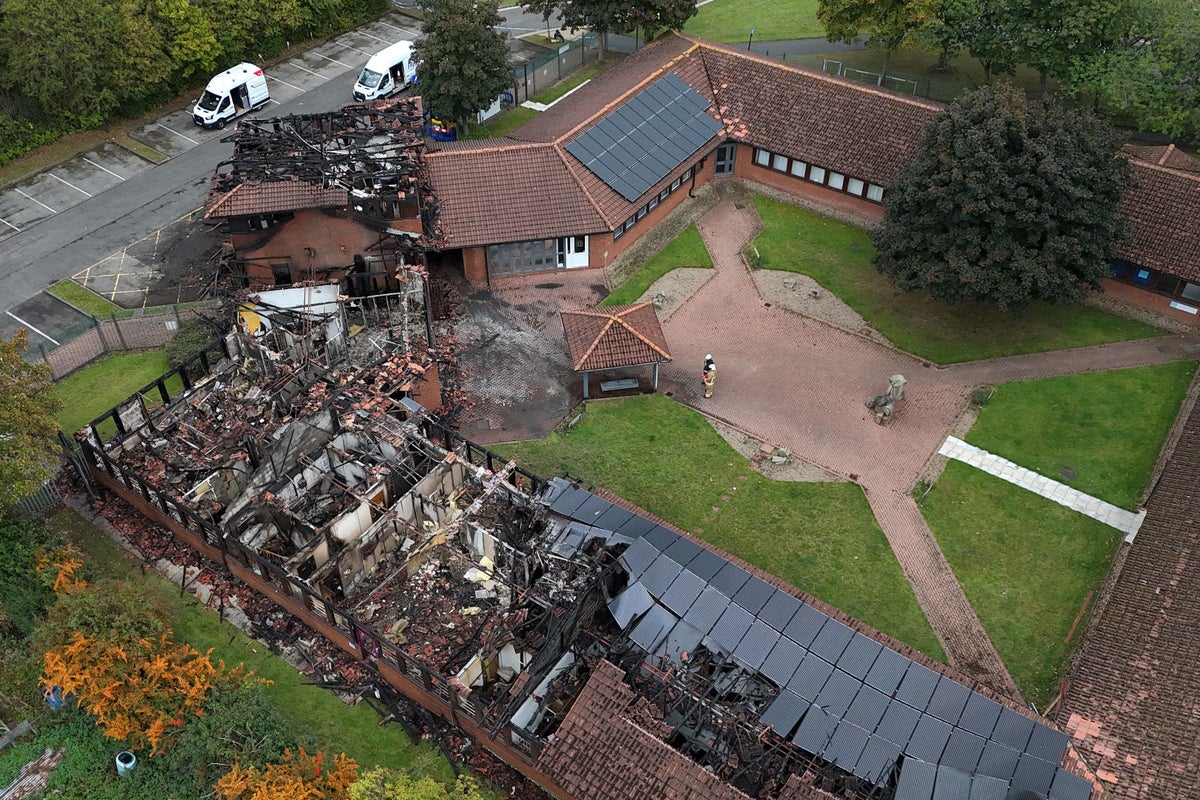 Aerial images show the roof in one corner has been destroyed and much of the building has been damaged.