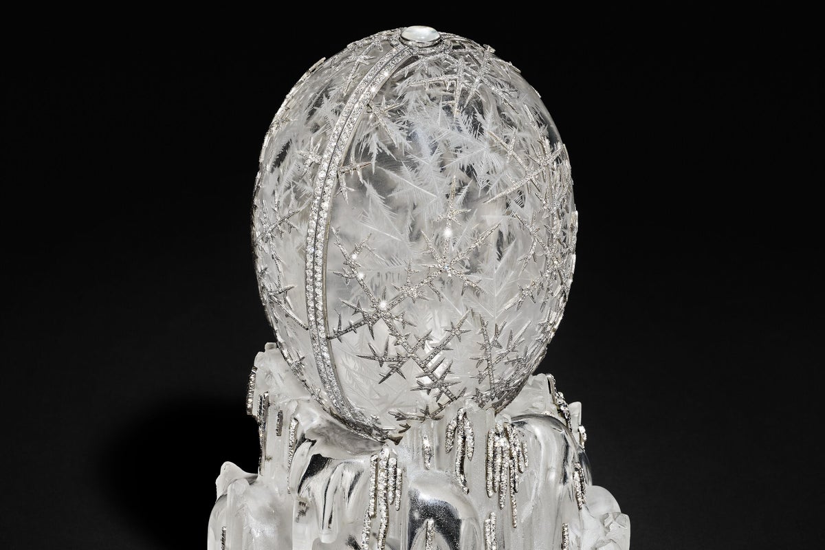It is finely carved in rock crystal and engraved on the interior with a frost design, while the exterior is applied with rose-cut diamond-set platinum snowflake motifs.