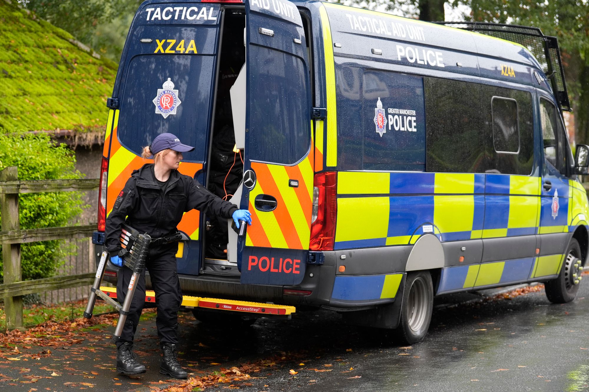 Members of the Police Tactical Aid Unit arrive at Langley Crescent, Prestwich, after two people died in a terror attack at the Hebrew Congregation synagogue in Crumpsall, Manchester