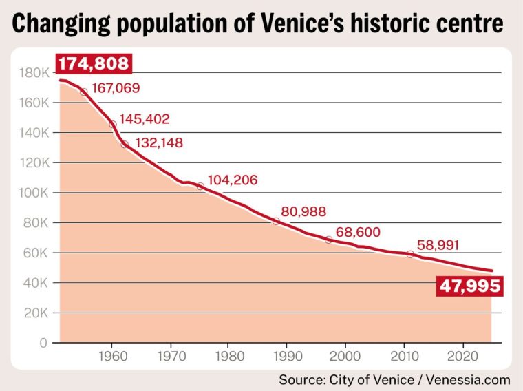 He is not being dramatic. Venice’s residential population has dwindled to its lowest point in history. Only 47,995 residents are left in Venice’s historic centre, according to Venessia.com, a residents’ activist group that has tracked the city’s decline for 25 years through municipal records.