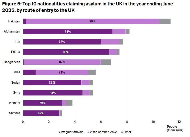 According to the Home Office, the top five nationalities with the largest number of people claiming asylum in the year ending June 2025 were Pakistan, Afghanistan, Iran, Eritrea and Bangladesh.
