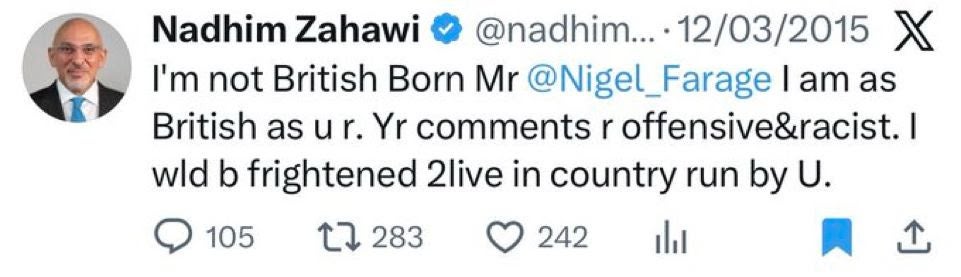 The post is one of several statements Mr Zahawi has previously made about the Reform UK leader.